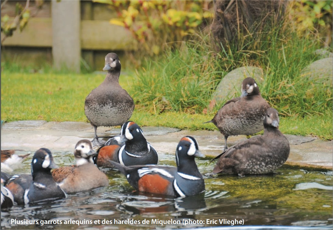 Depuis, j’ai toujours élevé quelques nichées de ces oiseaux très jolis et apprivoisés. Cela m’a permis également de m’offrir des garrots arlequin. Il m’apparaissait important que les garrots arlequins ne soient pas logés avec mes autres sortes de canards. Avant d’en acheter deux couples, j’ai donc fait quelques étangs en béton. Chaque année je vendais mes jeunes harles huppés chez Peter Kooij, en Hollande, et j’échangeais mes mâles de garrots chez lui pour d’autres mâles. Ainsi j’évitais la consanguinité des couples. J’ai mis les garrots avec mes harles huppés car ces derniers sont très tolérants. Je les ai installés dans un étang en béton de 17 m sur 2 m avec une profondeur de 45 cm. Les oiseaux se sont sentis tout de suite bien. Avant le début de l’hiver, les mâles commen- çaient à changer, et avoir leurs belles couleurs. A partir de la deuxième année les canards ont commencé à se mettre en couples. Ils ont alors copulé plusieurs fois par jour. Les femelles étaient occupées à faire de petits creux dans la terre sous le lierre et les conifères; je les voyais aussi souvent dans des troncs d’arbre creux. Cette année-là je n’ai pas eu d’œufs; il me tardait d’être l’année suivante.