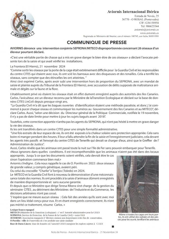 Notre association sœur, Aviornis Internacional Ibérica, a publié ce communiqué de presse...