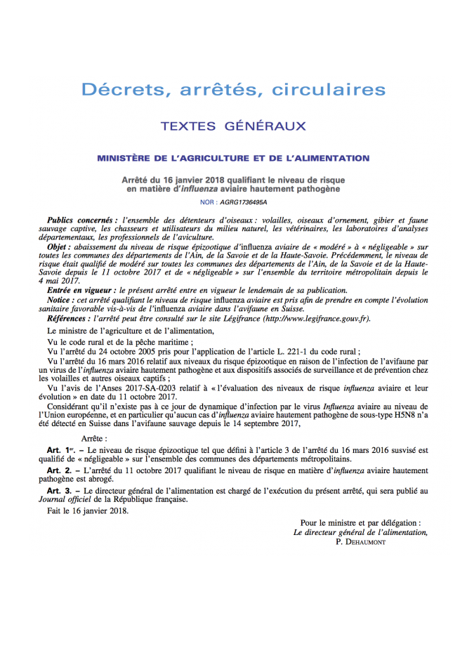 Objet : abaissement du niveau de risque épizootique d'influenza aviaire de « modéré » à « négligeable » sur toutes les communes des départements de l'Ain, de la Savoie et de la Haute-Savoie. Précédemment, le niveau de risque était qualifié de modéré sur toutes les communes des départements de l'Ain, de la Savoie et de la Haute-Savoie depuis le 11 octobre 2017 et de « négligeable » sur l'ensemble du territoire métropolitain depuis le 4 mai 2017.