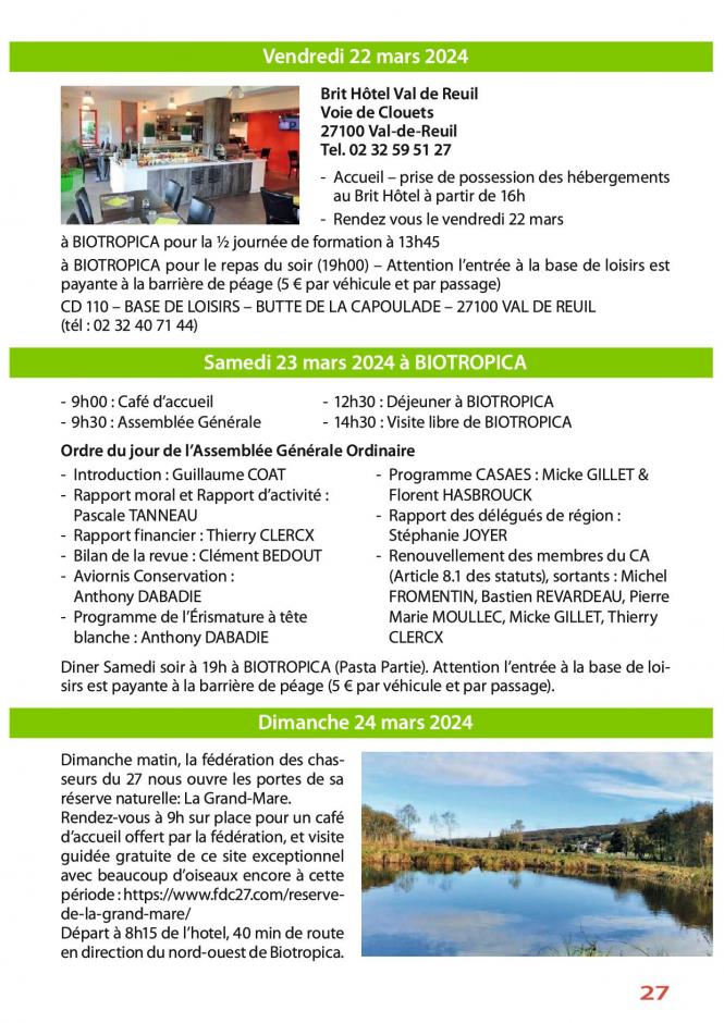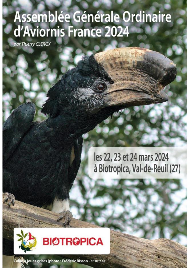 Enfin, vous pouvez réserver votre place pour l'Assemblée Générale d'Aviornis France organisée du 22 au 24 mars 2024 à Biotropica à Val de Reuil (27100) en renvoyant le bulletin d'inscription qui se trouve dans votre revue.
